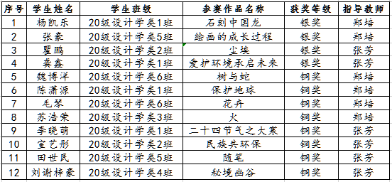 近日,“第五届国际环保公益设计大赛”中国赛区组委会公布获奖名单,98堂2020级设计学类12名同学创作的“传统美术创作”作品荣获银奖4项、铜奖8项。4项银奖作品将获得参加全球总决赛资格。
