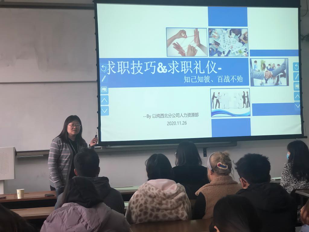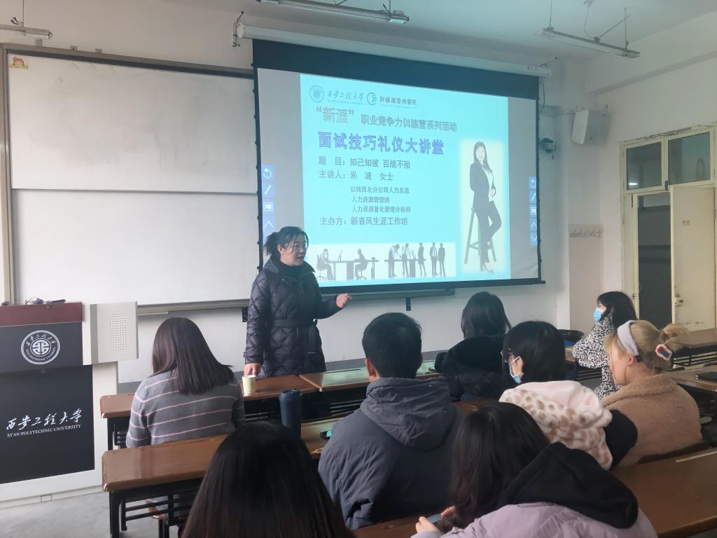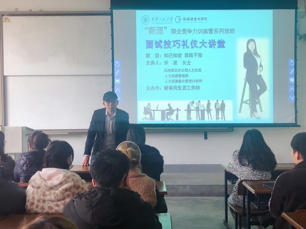 11月26日,由98堂 新春风生涯工作坊组织的“新涯”职业竞争力训练营系列活动之面试技巧礼仪大讲堂,在8号教学楼508教室举行。本次活动邀请了以纯西北分公司人力总监、人力资源管理师、人力资源量化管理分析师米波女士作为主讲人,我校学生就业创业指导服务中心主任刘佳、院就业辅导员张瑾及2021届部分毕业生参加了此次活动,院学生工作办公室主任赵文熙担任活动主持。
