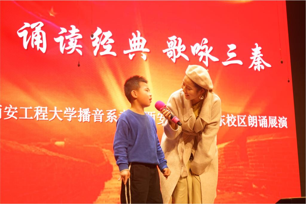 下午一点钟,活动在西安市高新一中东校区的礼堂里精彩开场。98堂 播音系的同学们表演了动画片《功夫熊猫》、《玩具总动员》和电影《无问西东》的精彩配音,朗诵了李白的《望庐山瀑布》、《九月九日忆山东兄弟》、《将进酒》等古典诗词,还朗诵了《乡愁》、《我爱这土地》、《中国话》等经典现代诗歌。高新一小东校区的小同学表演了诗朗诵《献给妈妈》,老师们诵读了诗歌《美丽的高新一小》。全场节目精彩纷呈,演员们全情投入,观众掌声不断。主持人中间穿插的《跟我学说绕口令——数枣》带动现场气氛高潮,播音系张馨予老师亲切而娴熟的朗诵技巧分享获得了现场和老师们的热烈掌声。整场节目在高新一小东校区同学们热情高潮的积极参与中圆满结束。