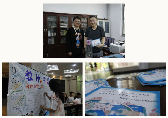 研会的学生干部为老师们精心准备了盲盒和不同种类的鲜花。老师在现场进行抽取,根据抽到的爱心纸条领取相应的鲜花,随后在事先准备好的签名板上签下自己的名字,和同学们合影留念。整个活动过程都弥漫着温情、幸福的气氛,洋溢着同学们对老师深深的敬意以及感激。