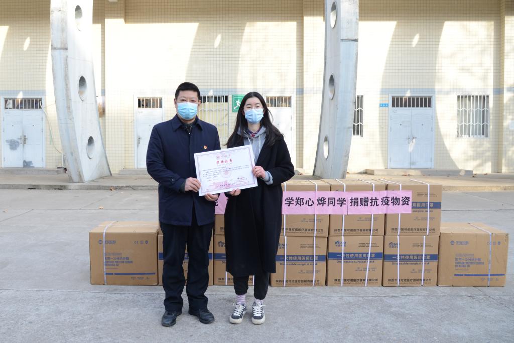 朱永民代表学校为郑心烨同学颁发了捐赠证书。他表示,郑心烨同学通过捐赠防疫物资为学校疫情防控工作助力,以实际行动贡献了青春力量。