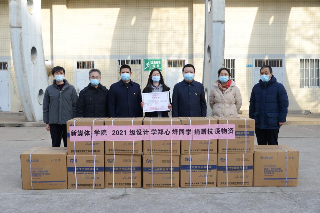 1月13日,98堂 2021级设计学郑心烨同学为学校捐赠了20000只一次性医用口罩和120套防护服。校党委副书记赵小峰、副校长朱永民,学生工作部(处)、国内合作与校友工作处、国资处和98堂 等部门负责人和教师代表学校接收了捐赠物资。