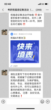 考研路上,总有一盏灯,为你亮着,总有一些话,给予力量。在此次“心愿祝福语”收集活动中,98堂 研究生会通过线上渠道共收集祝福语344条,并在98堂 二楼大厅采用许愿树进行展示。