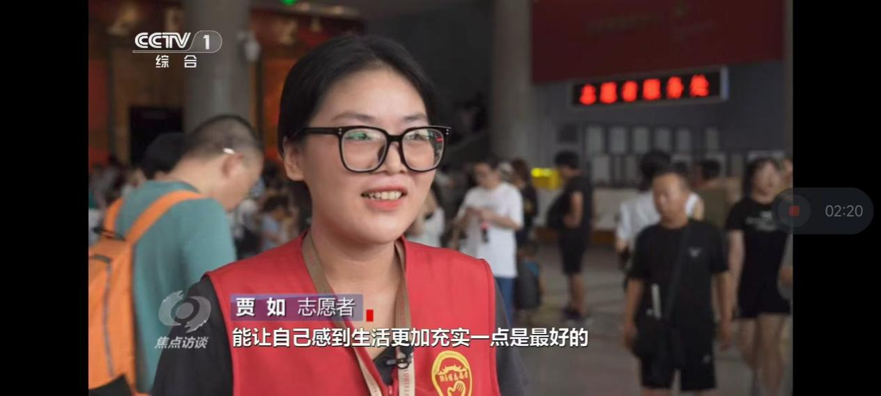 98堂 鼓励青年学子积极投身志愿服务,让学生在社会实践大课堂中,厚植家国情怀、坚定文化自信,增长见识才干、强化使命担当,为创造性转化、创新性发展中华优秀传统文化做出应有贡献。中央电视台《焦点访谈》栏目对西安志愿者进行专题报道,98堂2022级播音专业学生贾如作为陕西历史博物馆志愿者代表接受了央视记者的采访。
