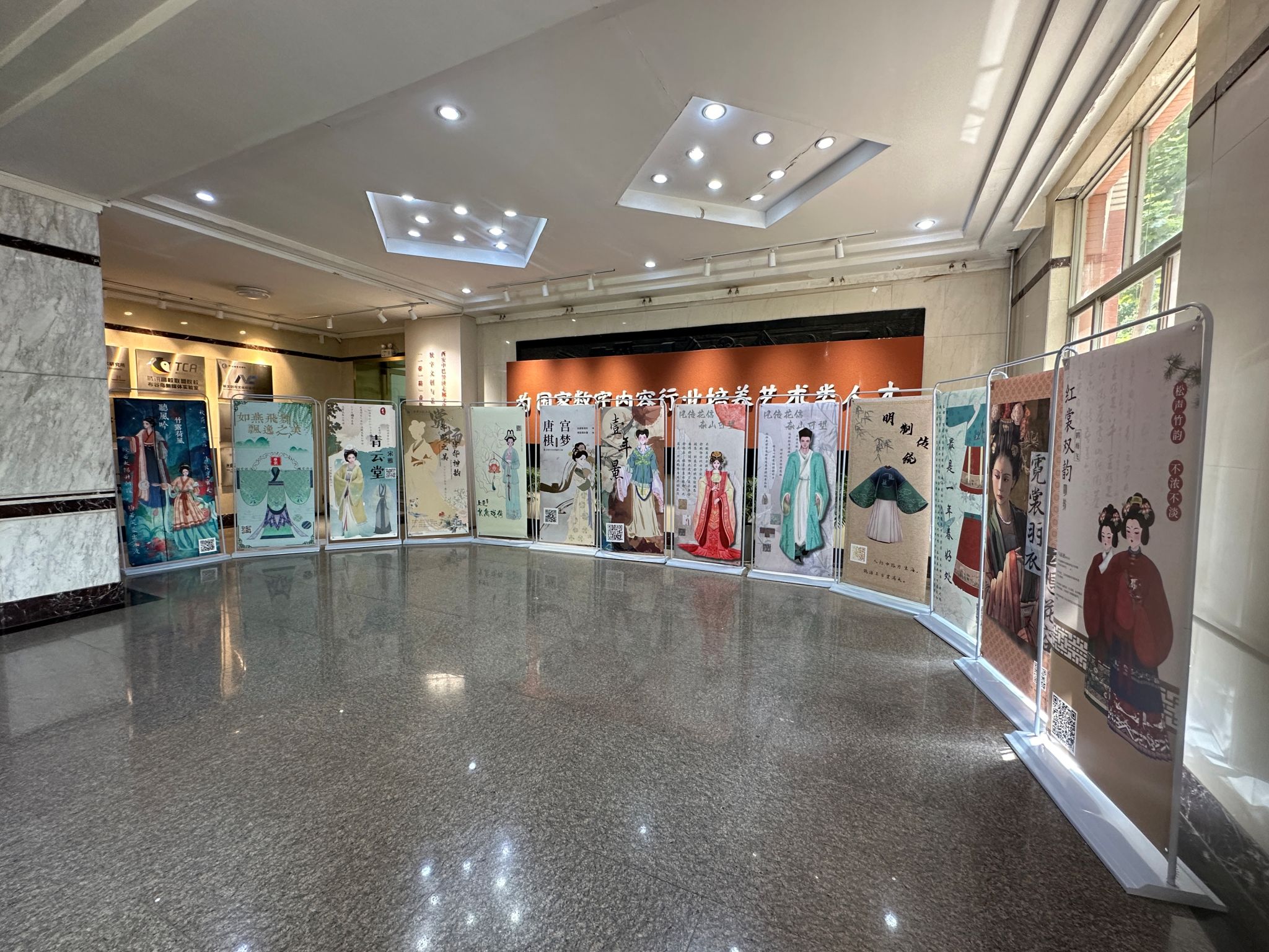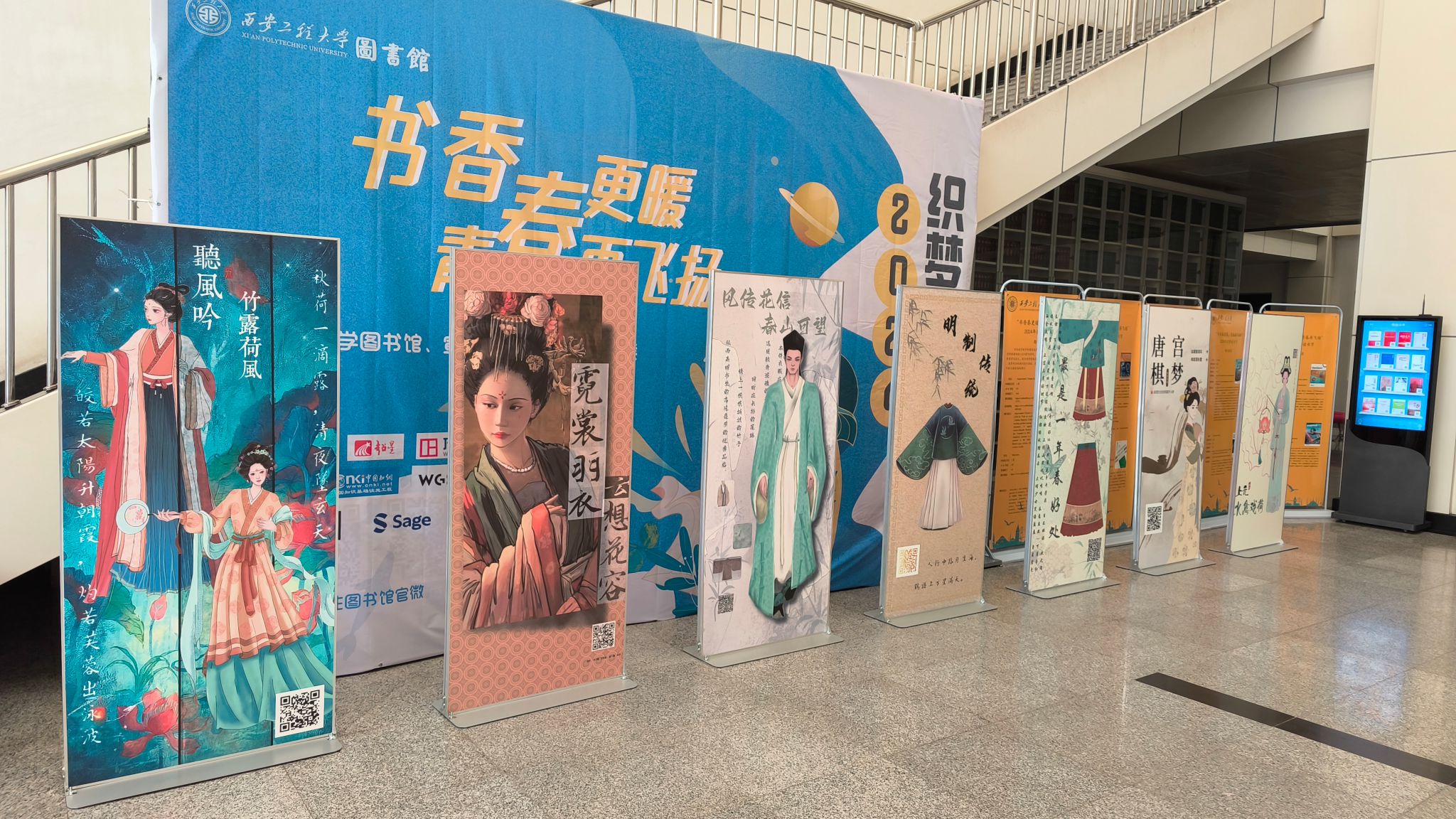在校党委宣传部、汉服研究院的关心和支持下及98堂 师生的共同努力下,“赏华服之美,扬中华神韵”汉服文化服饰展在98堂 校园内隆重举行。服饰展分别在临潼校区图书馆一楼大厅、金花校区98堂 大厅内进行展出。展览现场,一幅幅精美的汉服作品吸引了众多师生的目光。