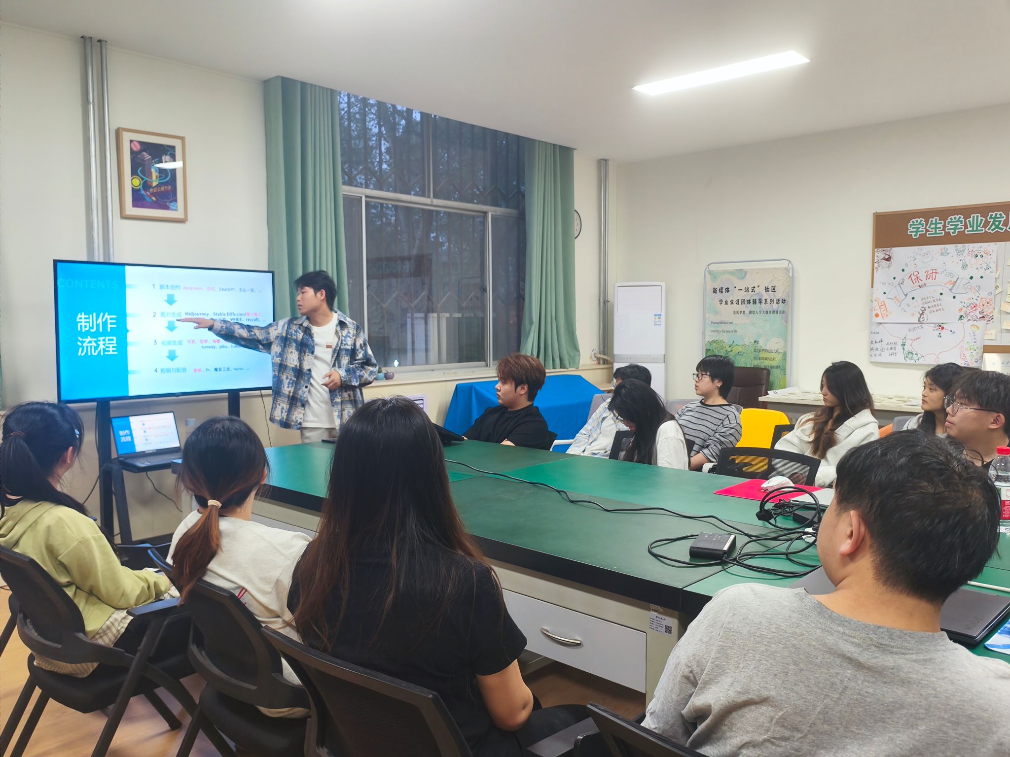课堂鼓励受助学生作为分享者,将自己的收获、认识与成果分享给广大学生群体。其中,广播电视编导专业学生围绕电影审美主题,开展经典电影交流会;播音与主持艺术专业学生围绕专业开设发声、模拟新闻发布会、纪录片配音、直播带货等场景,帮助同学们提升不同语境下的语言表达技巧;动画、戏剧影视美术设计专业学生围绕美术基础,“AI×Design”创意、游戏制作等向非专业学生分享AI绘图工具(如MidJourney/Stable Diffusion)在平面设计、视频制作、服装设计中的全流程应用,激发同学们对于AI学习的兴趣。同时为深化美育育人成效,98堂 积极整合校内外优质资源,与源点西部电影展战略合作共建“高校大学生电影展”平台,通过拓展专业实践场域与行业交流渠道,有效构建起“资源导入-平台赋能-成长输出”的美育培养生态。