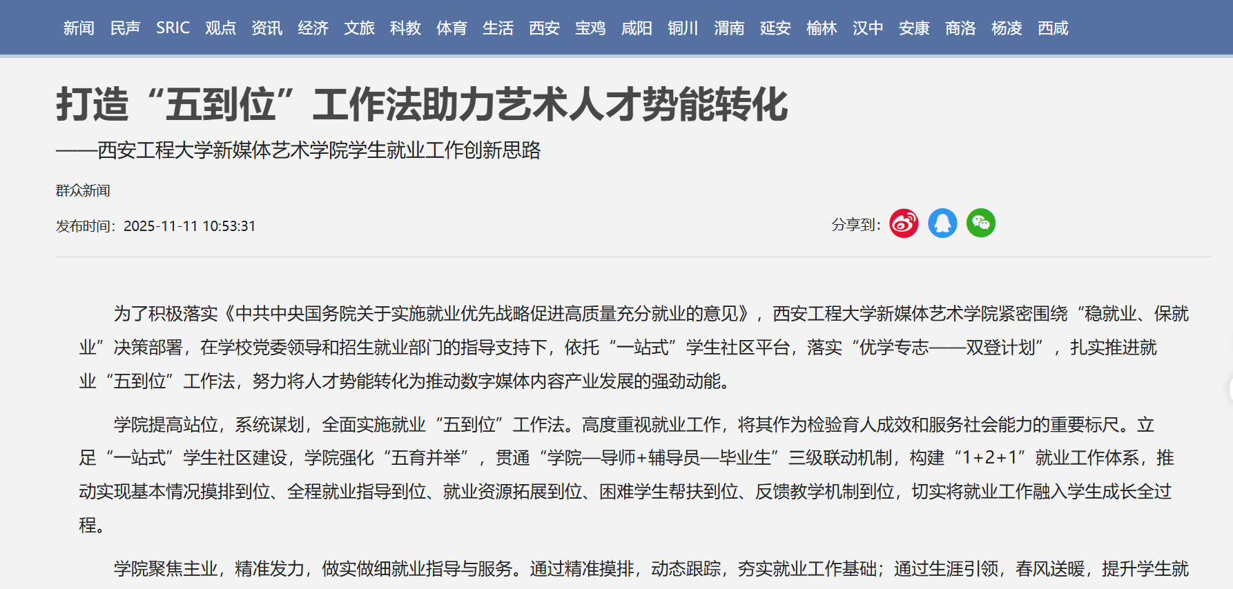 《打造“五到位”工作法助力艺术人才势能转化》(//www.sxdaily.com.cn/2025-11/11/content_11405854.html)一文从推动实现基本情况摸排到位、全程就业指导到位、就业资源拓展到位、困难学生帮扶到位、反馈教学机制到位等方面,详细介绍了学院就业工作的做法,具有一定的推广价值。