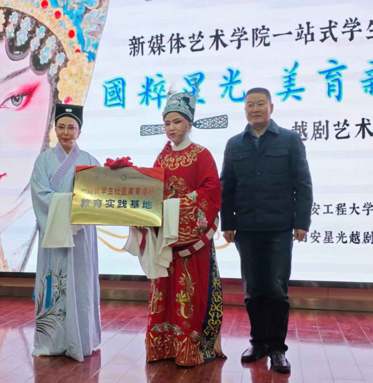 活动伊始,学院党委书记张瑾致辞,他对西安星光越剧团的到访表示热烈欢迎,强调了“高雅艺术进校园”活动以美育人、以美化人、以美培元的活动宗旨,并表示将以此次活动为契机,扎实落实立德树人根本任务,不断推进学校人才培养质量,为学校高质量发展做出应有的贡献。致辞结束后,现场举行了“98堂 一站式学生社区美育浸润活动实践基地”授牌仪式,学院领导为星光越剧团团长韩若梦、副团长韩菁授牌,标志着双方将在戏曲文化传播、美育实践活动等方面开展更深层次的合作。星光越剧团也向学院领导送上了定制的《梁祝》剧照台历,以作友谊纪念。