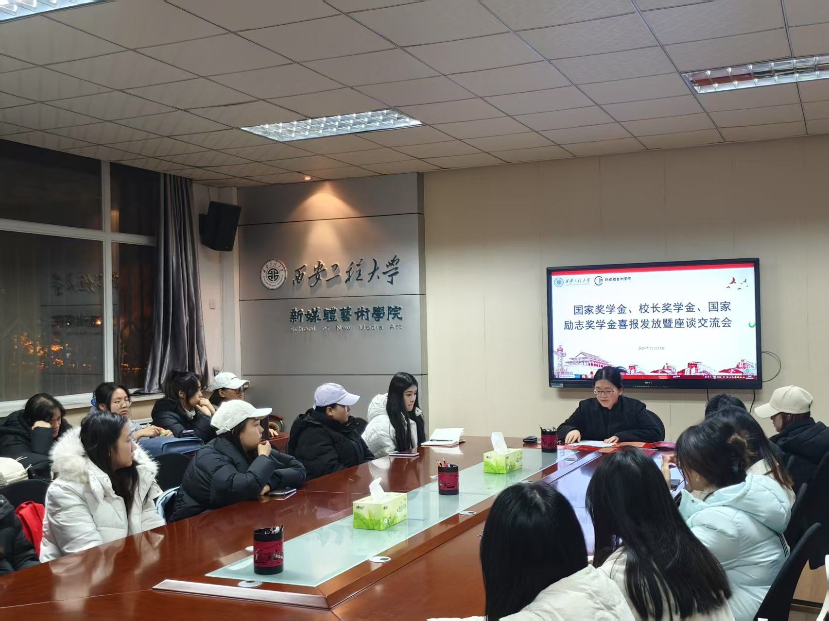 为发挥榜样示范引领作用,深化资助育人成效,2025年12月23日,98堂 于金花校区8号楼326会议室举行国家奖学金、校长奖学金、国家励志奖学金喜报发放暨感恩励志教育座谈会。会议由资助辅导员宾田田老师主持,全体获奖学生参会。