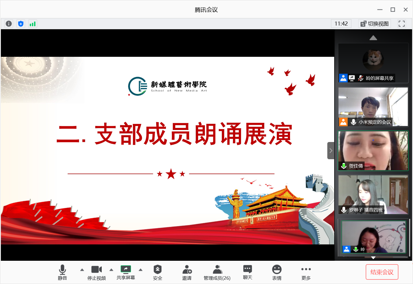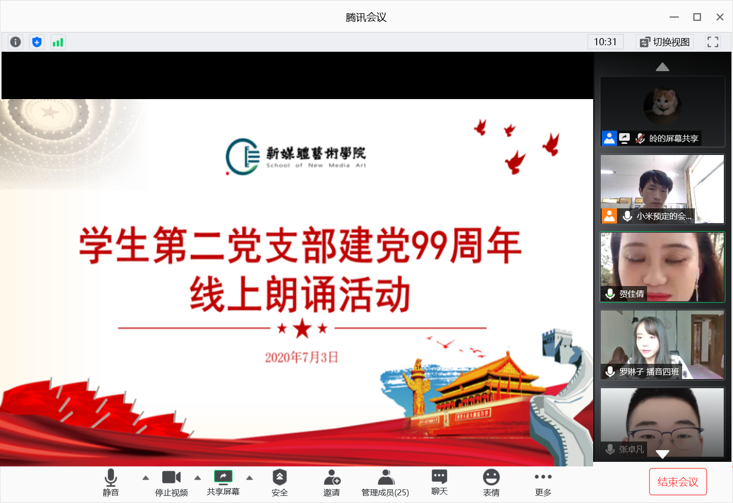 2020年7月3日,98堂 学生第二党支部通过腾讯会议平台开展“建党99周年”线上主题朗诵活动,会议由支部书记刘东欢主持,支部全体党员参加了此次活动。