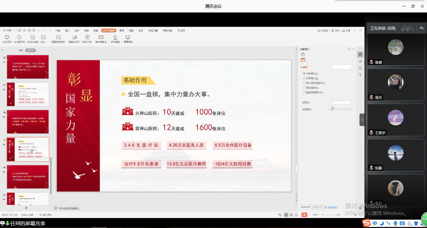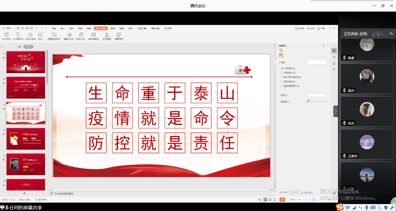 接下来,四名党员同志依次分享了疫情期间的战“疫”故事。王昊宇同志以某综艺节目中,选手赵粤父亲的抗疫故事为例,用贴近年轻人的人物故事,向我们传达了抗疫英雄“舍小家为大家”的奉献精神。任珂同志以“同袍”为主题,向我们讲述了抗疫英雄易凡、胡卫锋医生与病魔斗争的故事,传达出我们国家面对疫情彰显的国家力量、人民力量和同胞力量。同时,袁梦同志以时间为轴串讲了钟南山院士在抗击非典、新冠病毒期间的伟大贡献和奋斗精神,强调大家向这位最强逆行者致敬,我们应当有坚守有信仰有担当,为祖国更好的明天而不懈奋斗。此外,李珏雯同志结合所学专业,谈到综艺节目在向大众传播抗疫故事和抗疫精神中的重要作用,并提议作为新闻与传播专业的研究生,我们应该逐一了解、发挥所长,为更好传播抗疫故事贡献自己的力量。