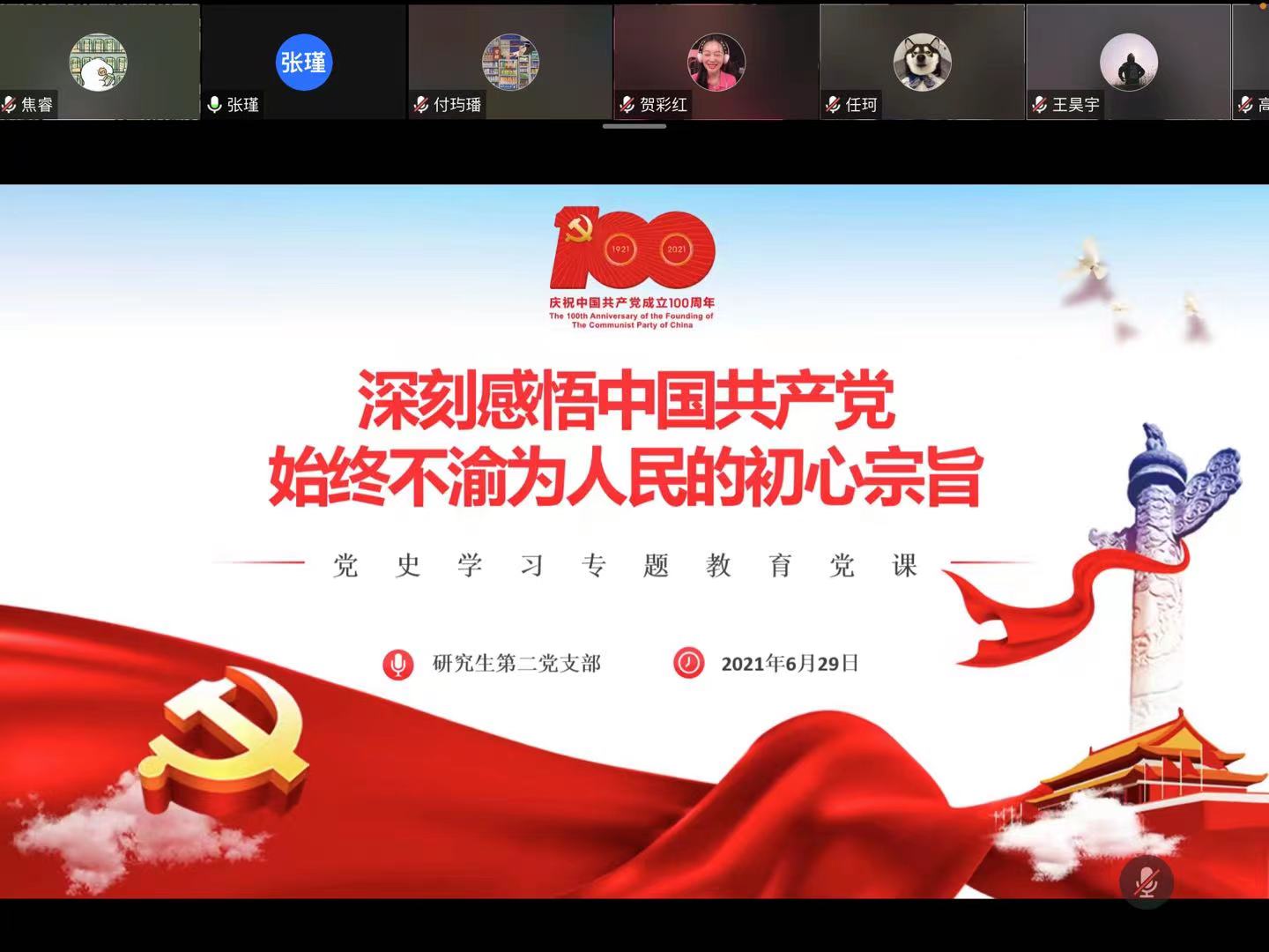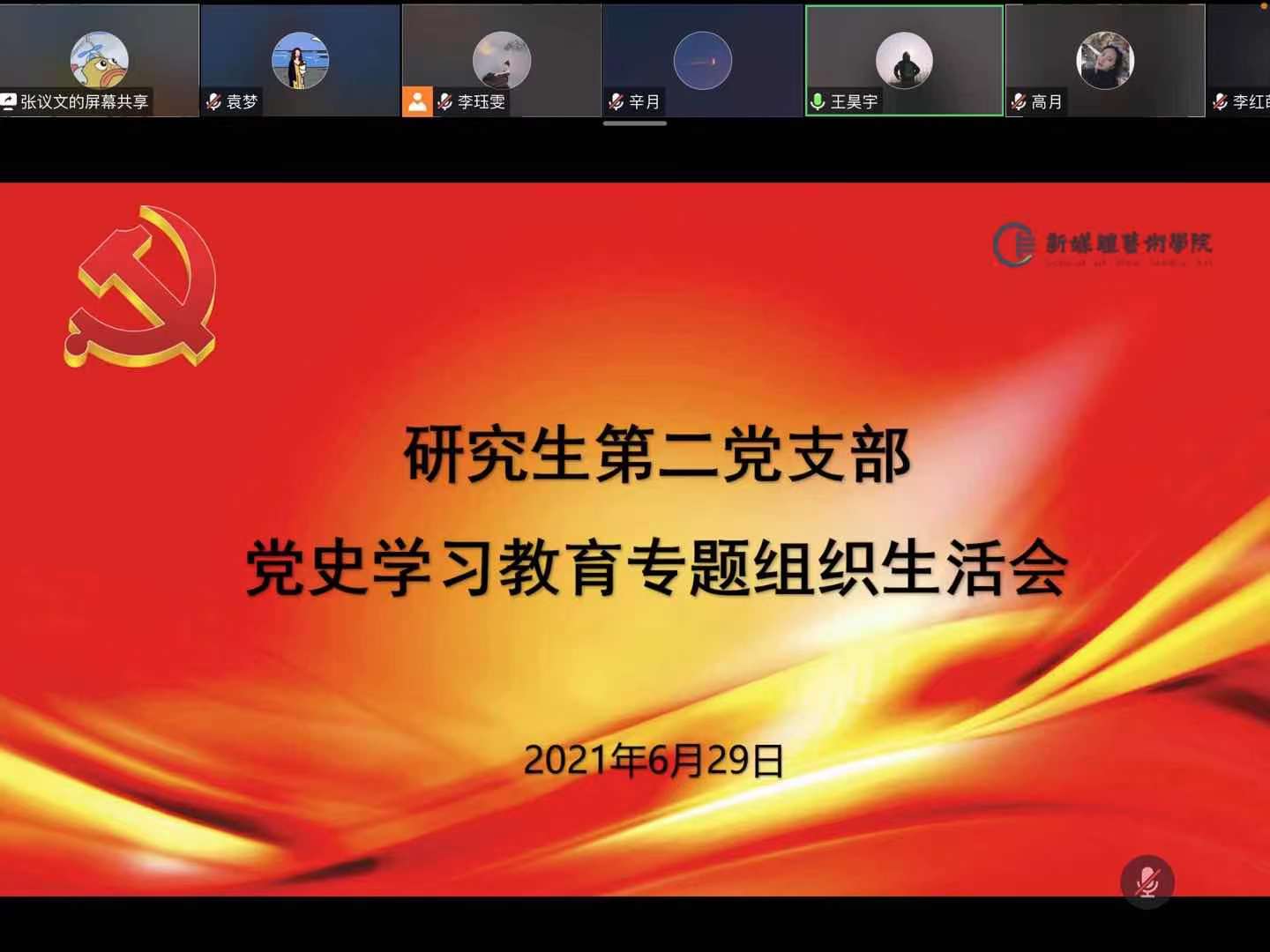 2021年6月29日晚,98堂 研究生第二党支部在腾讯会议组织开展了党史学习教育专题组织生活会,会议由支部书记张瑾主持,全体党员参加本次组织生活会。