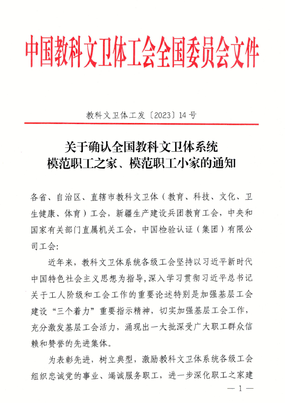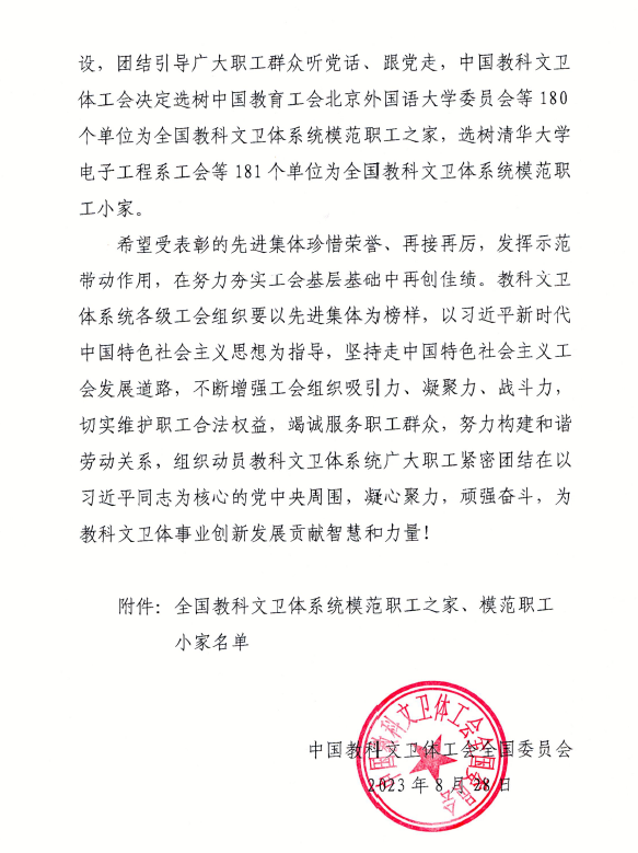 近日,中国教科文卫体工会全国委员会印发《关于确认全国教科文卫体系统模范职工之家、模范职工小家的通知》,我校98堂 分工会被授予“全国教科文卫体系统模范职工小家”称号。