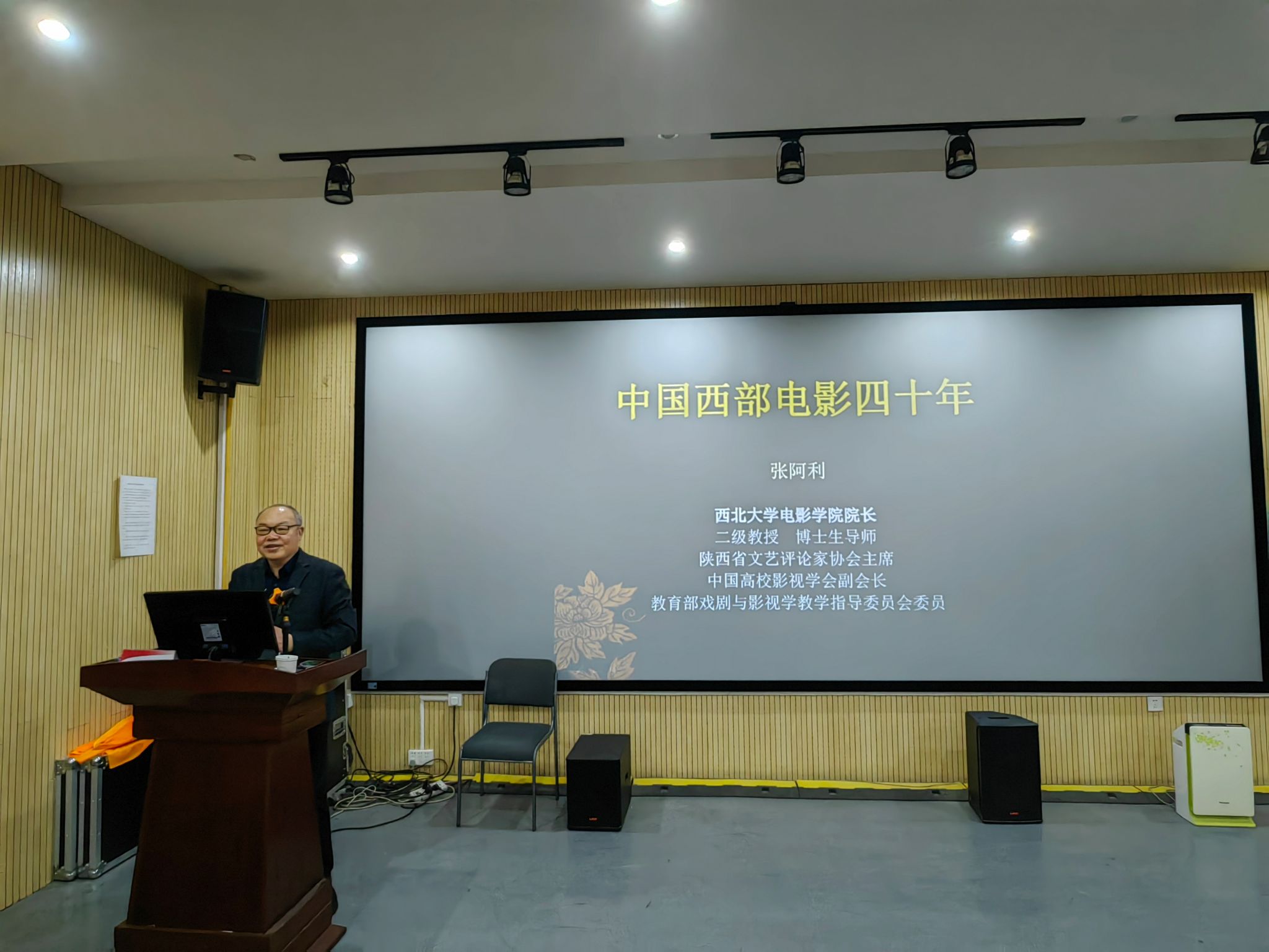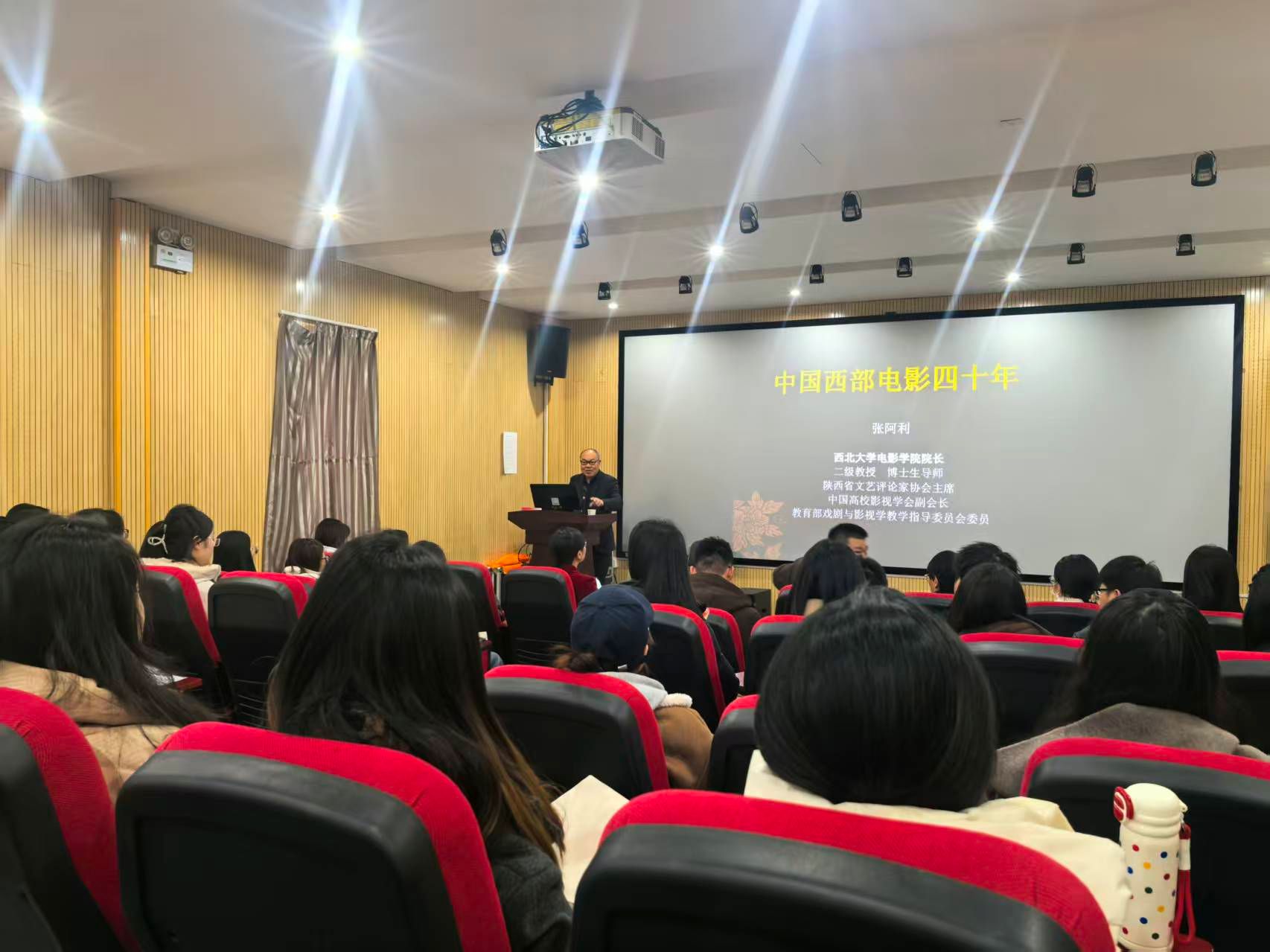 主题报告中,张阿利教授围绕“西部电影40年”这一主题,从西部电影的背景与概念界定出发,系统梳理了钟惦棐先生提出的西部电影理论及其争鸣历程,深入阐释了西部电影的美学特征及其与民族传统文化的深刻关联。他细致分析了第四代、第五代导演与西部电影的渊源,剖析了新世纪以来西部电影的发展脉络与新时代实践路径。讲座结语部分,张阿利教授以民族性、地缘性、时代性为核心坐标,强调西部电影应扎根地缘美学、涵育本土话语,在彰显民族个性的同时观照人类共同命题,并结合《山海情》《海的尽头是草原》等作品案例,指出新时代西部电影应深入开掘地缘文化内涵,肩负起展现可信、可爱、可敬中国形象的使命。