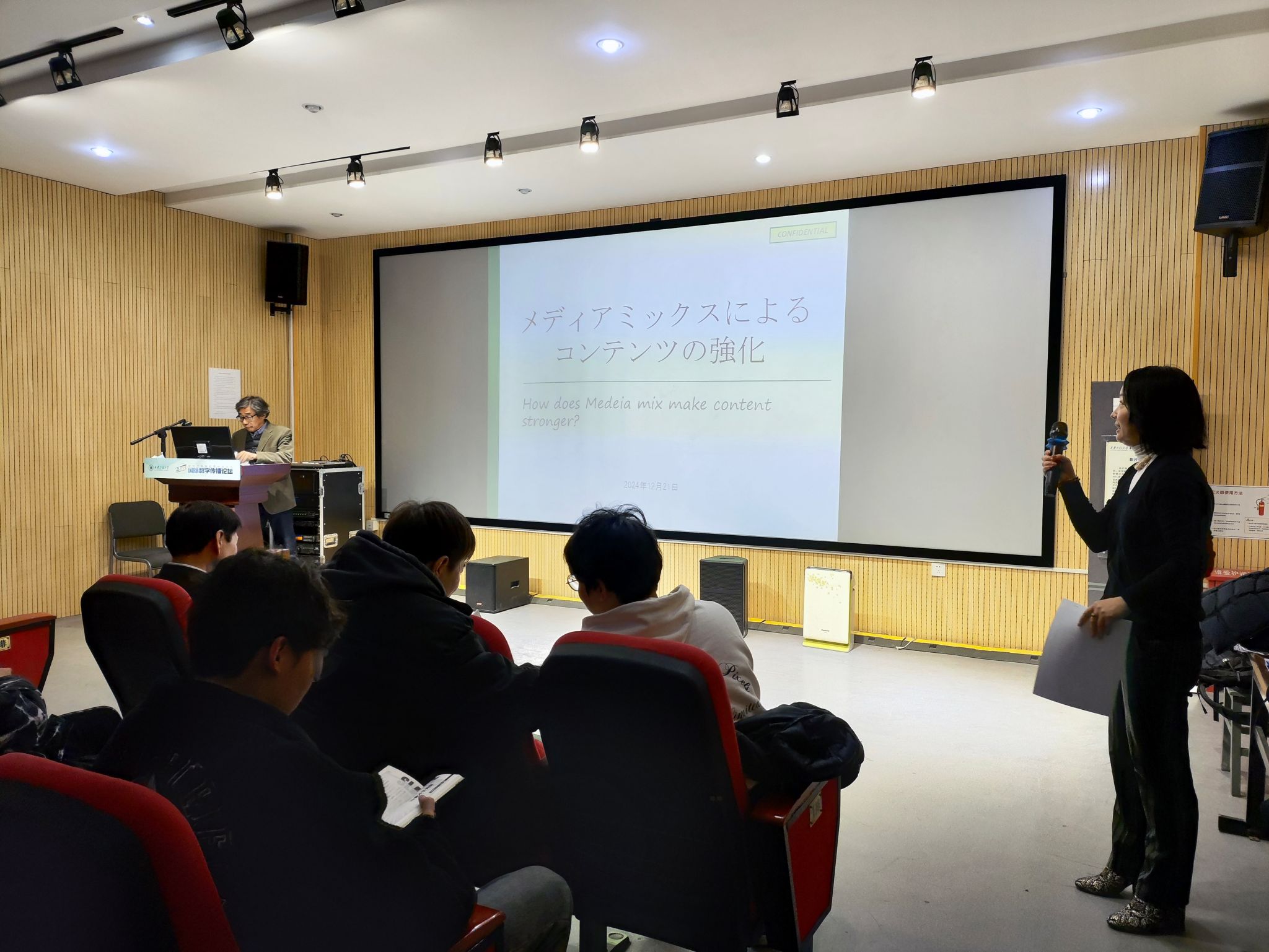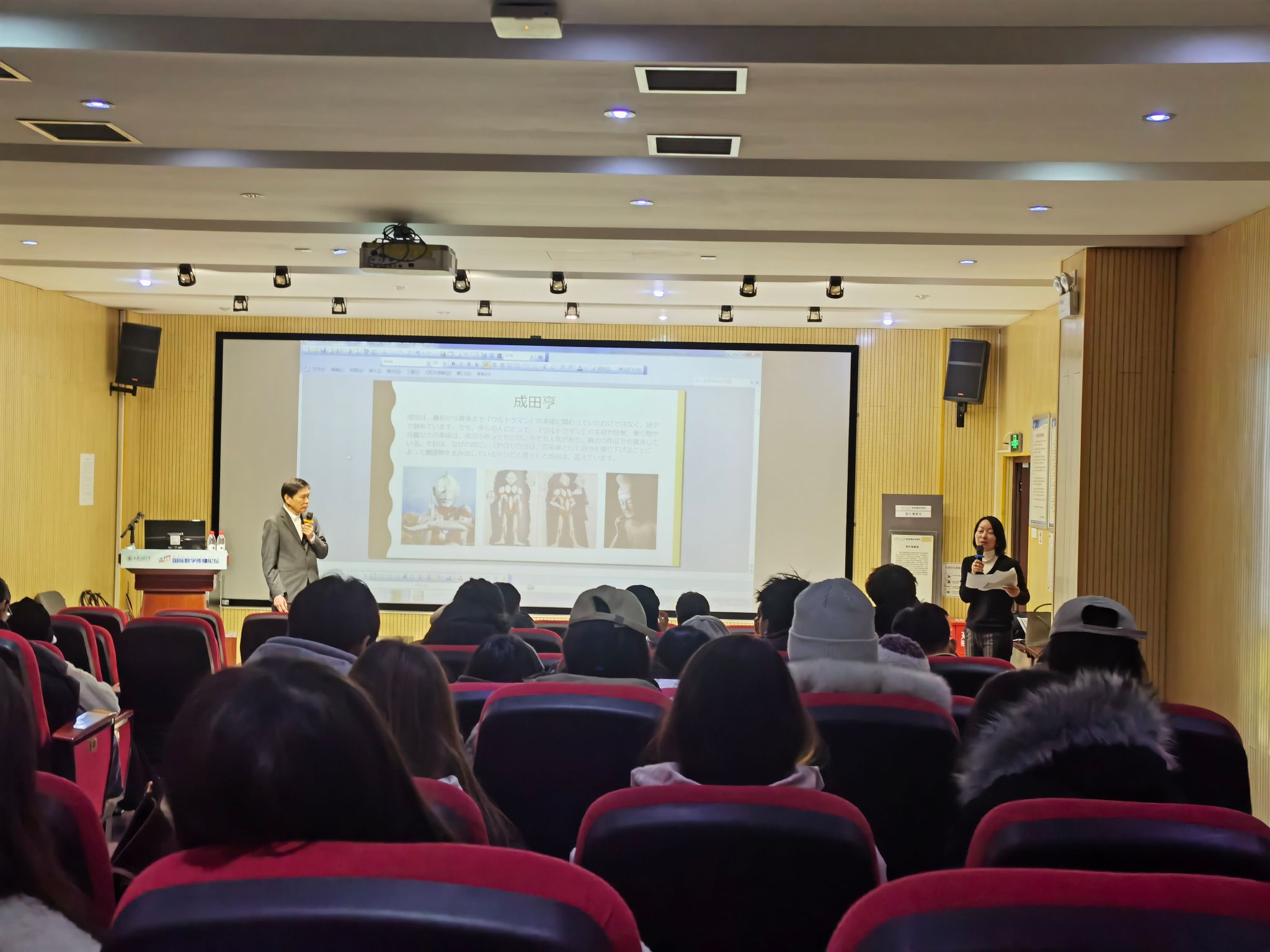 高桥克三、吉田隆两位老师面向98堂 师生分别开展专题学术讲座。高桥克三老师讲述了成田亨、高山良策、小林七郎三位日本代表性艺术家创作家喻户晓的奥特曼、特斯拉的过程,播放了部分珍贵视频,并讲述了中国文化对日本文化的深刻影响,以及两国之间语言表达的相同之处。吉田隆老师介绍了日本的动漫、游戏、杂志如何延伸为影响世界的流行文化,并现场分享了中日间最流行的动漫杂志和书籍,以及如何通过一本书籍或者文学作品找到作品的灵感及叙事方法。