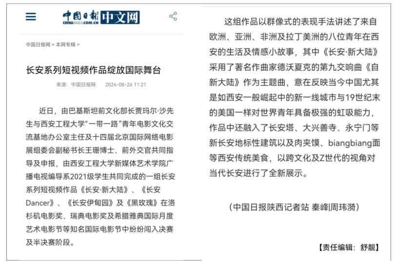 提名作品由巴基斯坦前文化部长贾玛尔·沙先生,前外交官、“一带一路”青年电影文化交流基地王珊博士共同指导及申报。五部作品是一组以长安为主题的系列短视频作品,其中四部为98堂 广播电视编导系2021级本科学生创作:《长安·新大陆》获洛杉矶电影奖最佳学生影片荣誉提名,《长安Dancer》获瑞典电影奖短片最佳导演提名及Altff多伦多独立电影节最佳国际学生影片提名,《长安伊甸园》获瑞典电影奖短片最佳导演提名及Altff多伦多独立电影节最佳国际纪录片提名,《黑玫瑰》闯入雅典国际月度艺术电影节决赛。此外,98堂 2023级艺术(广播电视)硕士全体研究生共同完成的作品《烛影拾光》入围斯德哥尔摩城市电影节半决赛。