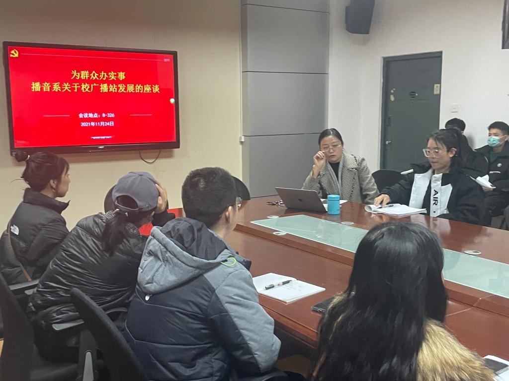 2021年11月24日下午,为切实落实为群众办实事,发挥党史学习作用,立足教育实际,把党史学习同总结经验、关照现实、推动工作结合起来,将党史学习教育成果转化为推动98堂 发展、学生成长的动力,播音教工支部在金花校区八号楼326会议室举行以“共同促进校广播台发展”为主题的师生座谈会。会议由播音系主任肖爱云老师主持,播音系全体老师以及广播台部分同学参加了本次会议。