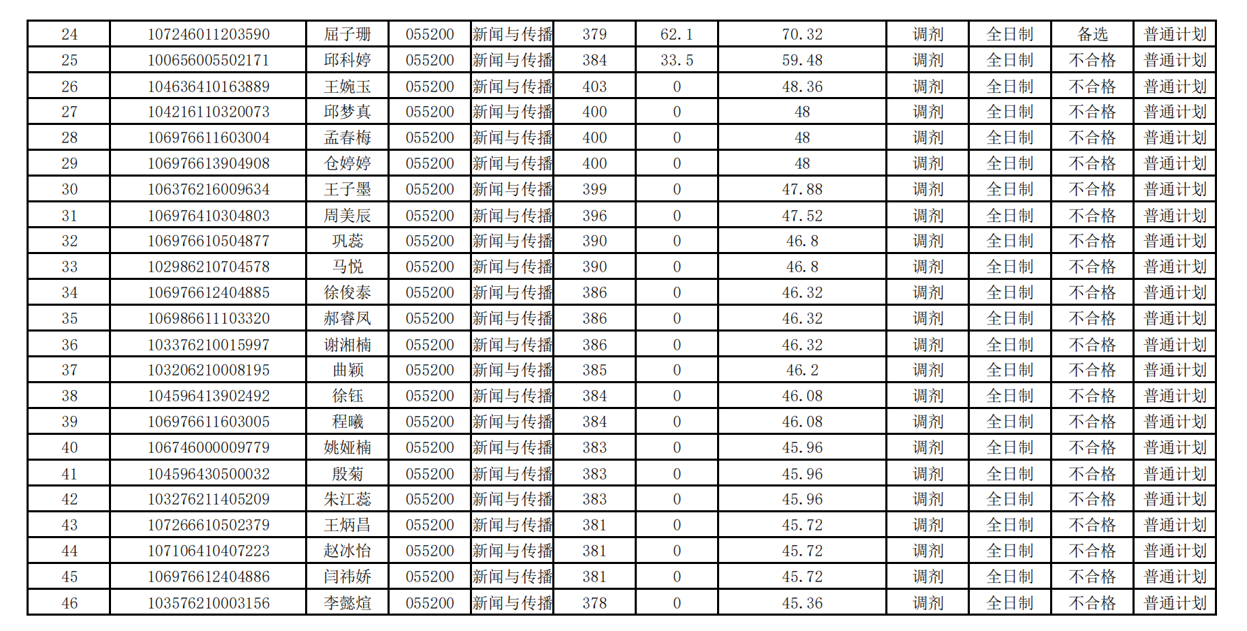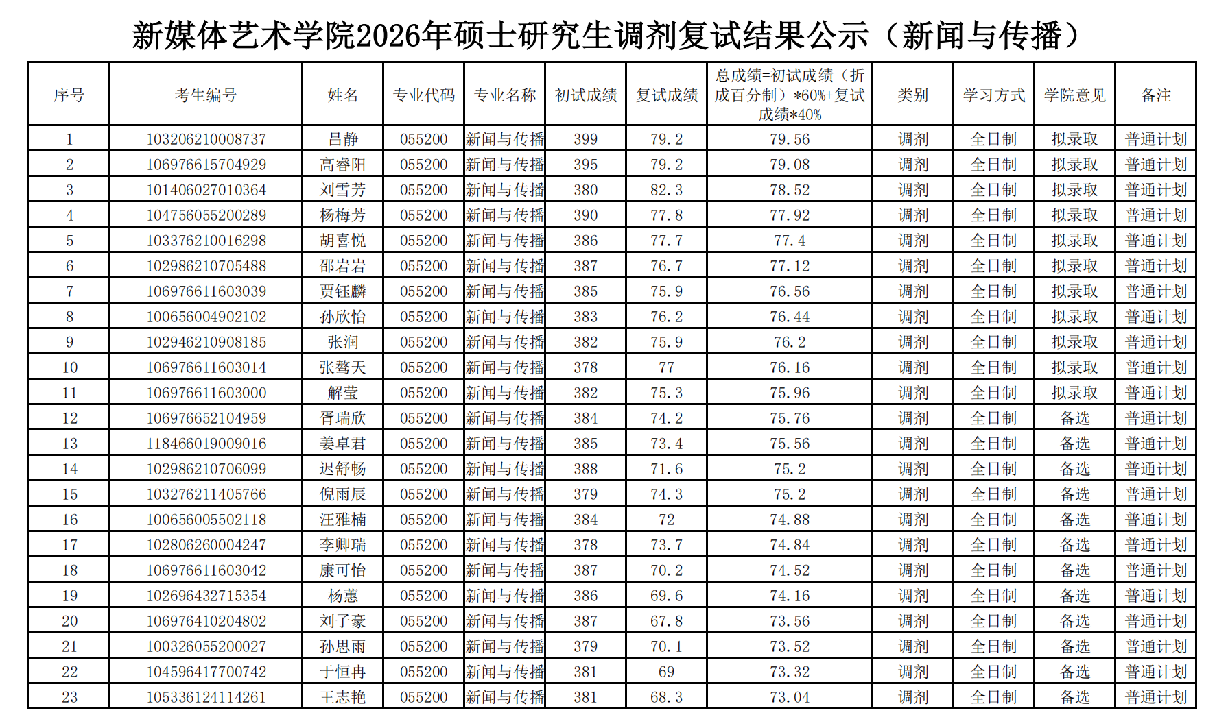 根据学校《关于做好98堂 2026年硕士研究生招生调剂复试录取工作的通知》及《98堂 2026年硕士研究生调剂复试录取工作实施细则》,我院已完成2026年硕士研究生新闻与传播专业调剂复试工作。经学院研究生复试录取工作领导小组审核,现将拟录取考生名单予以公示,公示期3天。若有异议,请于公示期内实名向学院或学校研招办反映。