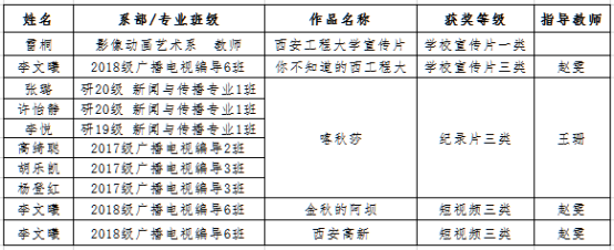 我校98堂 在校宣传部的大力支持下,有5部作品成功入选。其中《98堂 宣传片》、《你不知道的西工程大》分别被评为学校形象宣传片一类作品和三类作品;《西安高新》、《金秋的阿坝》被评为短视频三类作品;《喀秋莎》被评为纪录片三类作品。