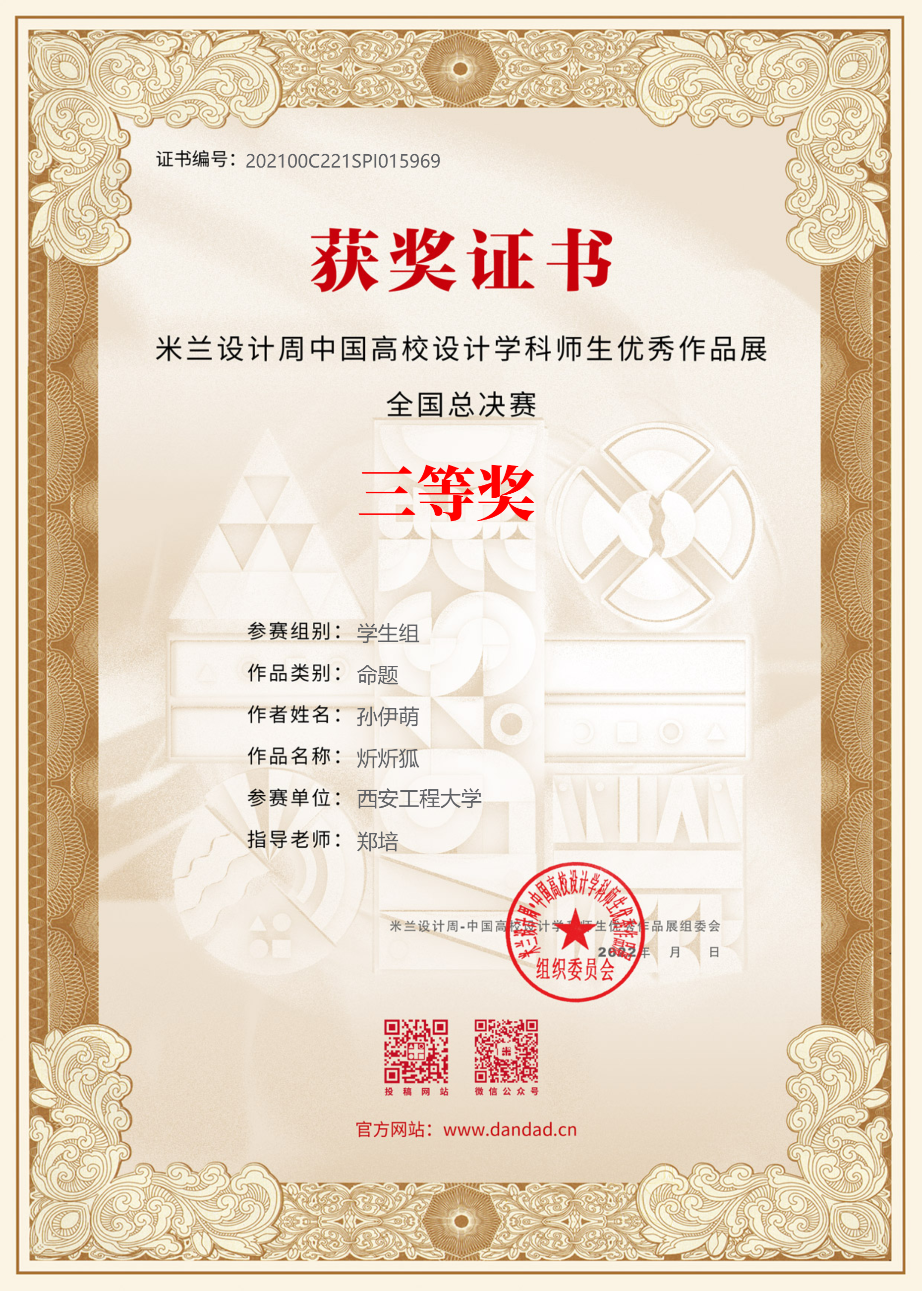 近日,2022“米兰设计周—中国高校设计学科师生优秀作品展”命题赛获奖名单发布,98堂 2021级设计学类3班孙伊萌同学作品《炘炘狐》获得全国总决赛三等奖。