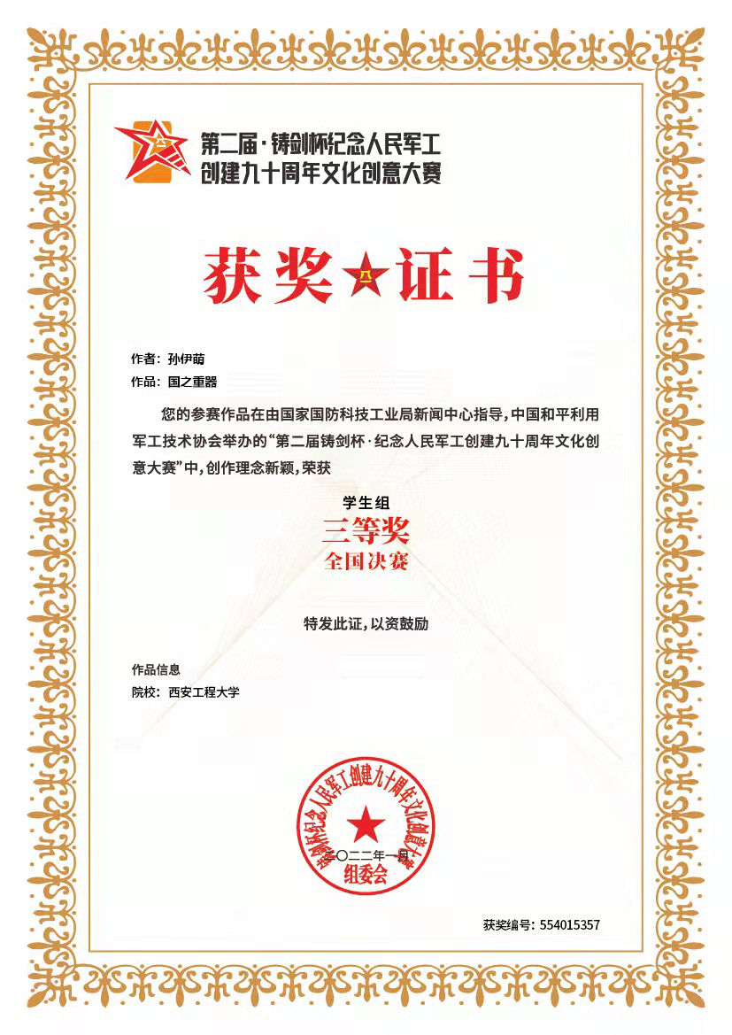 在“第二届铸剑杯纪念人民军工创建九十周年文化创意大赛”中,98堂 2020级戏剧影视美术设计2班张佳秀同学作品《守护者》获得二等奖;21级设计学类3班孙伊萌同学作品《国之重器》(指导教师:郑培)获得三等奖。