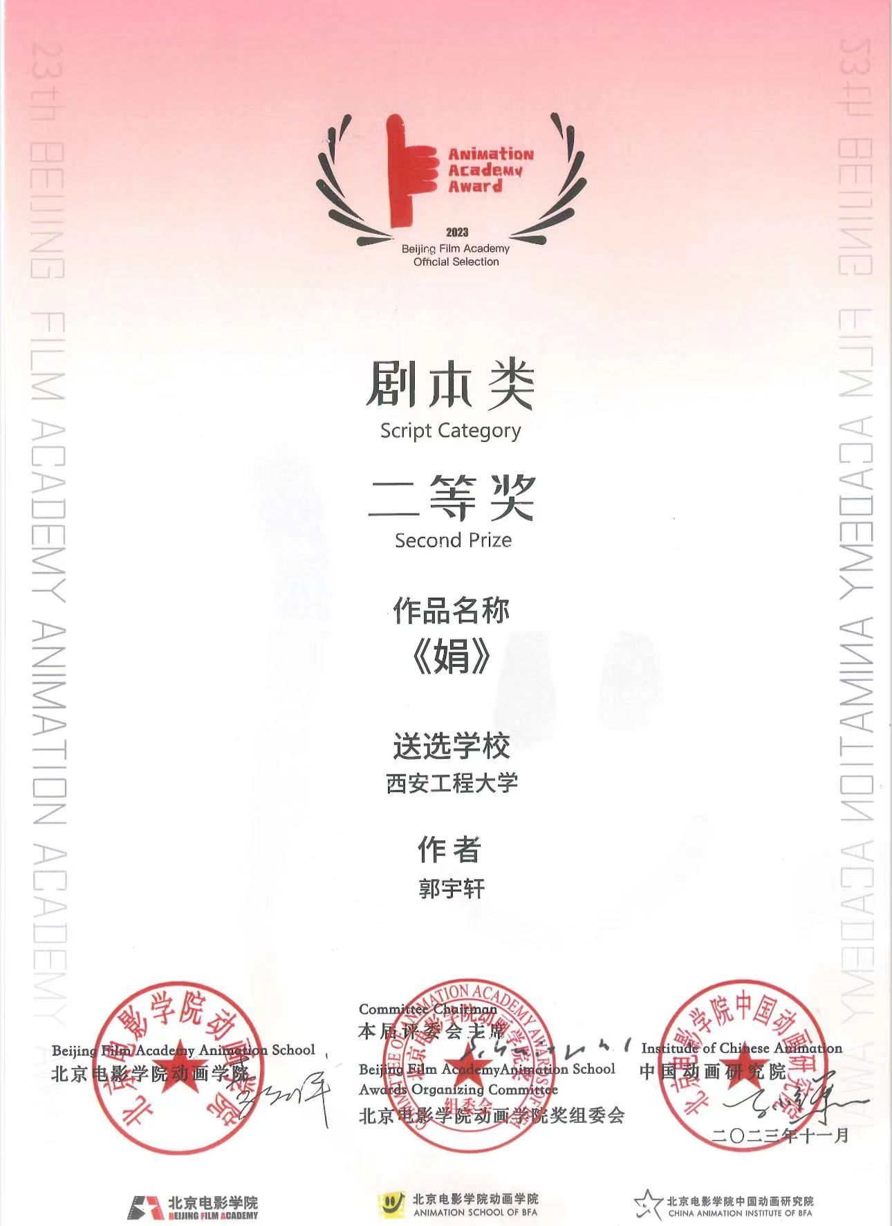 第二十三届北京电影98堂 动画98堂 奖落下帷幕,98堂 广播电视编导专业23级学生郭宇轩参赛剧本《娟》荣获剧本类二等奖。剧本以学龄儿童心理健康为主题,通过回溯的方式展现了儿童对世界、人际关系的最初思考。该作品将焦点放在学龄儿童的内心世界,用细腻的视角捕捉他们对世界的好奇和人际关系的初步理解。作品具有极高的实验性、创新性和艺术性,所展现的思考深度和人性洞察,令人赞叹。