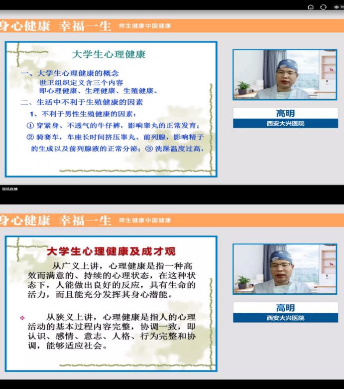 本次讲座以线上形式进行,讲座包括健康的生活方式、新冠肺炎预防、人体常见疾病的处理和预防等三个方面内容。高明主任讲授了大学生健康现状及影响因素、大学生心理健康常见的问题及如何应对,从医者的角度提醒青年学子要培养良好的生活方式,掌握最基本的安全防护和自我保健知识。对于成长和成才观,高明分享了自己的科技成才之路,建议学子们要正确认识自己,认识自己的生理特点、心理特点,认识自己的优势、劣势,知道“我能做什么,我要做什么”。告诉广大学子生涯规划重在行动,成功源于有效的时间管理,成功关键在于努力学习本领和师长的教育支持;结合当前疫情防控形势,高明对新冠肺炎病毒的来源、传播途径以及在日常生活中如何做好防护等进行了详细的讲解和说明。结合自己的临床专业知识,还为师生讲解了常见泌尿生殖相关疾病的诊治,并对艾滋病的传播、预防和治疗进行了宣讲。高明主任的讲座深入浅出,语言生动诙谐,激发了广大师生和家长的关注和兴趣,大家认真倾听,积极互动,师生就新冠肺炎疫情防护、心理问题、常见病治疗等热点问题积极提问,高明主任一一进行了解答说明,整个讲座过程气氛热烈,秩序井然,师生们在轻松愉快的气氛中接受了健康知识的普及教育。
