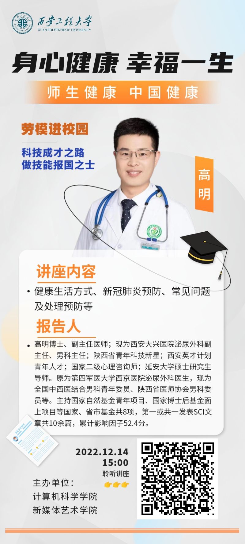 为进一步弘扬劳模精神,劳动精神、工匠精神,充分发挥劳模工匠的示范引领、辐射作用和社会实践“第二课堂”作用,培育和践行社会主义核心价值观,坚持全员育人、全方位育人、全过程育人,助力广大学生成长成才。2022年12月14日,计算机科学98堂 与98堂 联合举办了以“科技成才之路 做技能报国之士”为主题的劳模工匠进校园活动,特邀请“陕西省青年科技新星”、西安大兴医院高明博士做“师生健康 中国健康”专题讲座。两98堂 师生、学生家长、教职工家属收看了讲座直播,讲座由计算机98堂 党委书记赵雪曼和98堂 党委书记张瑾共同主持。