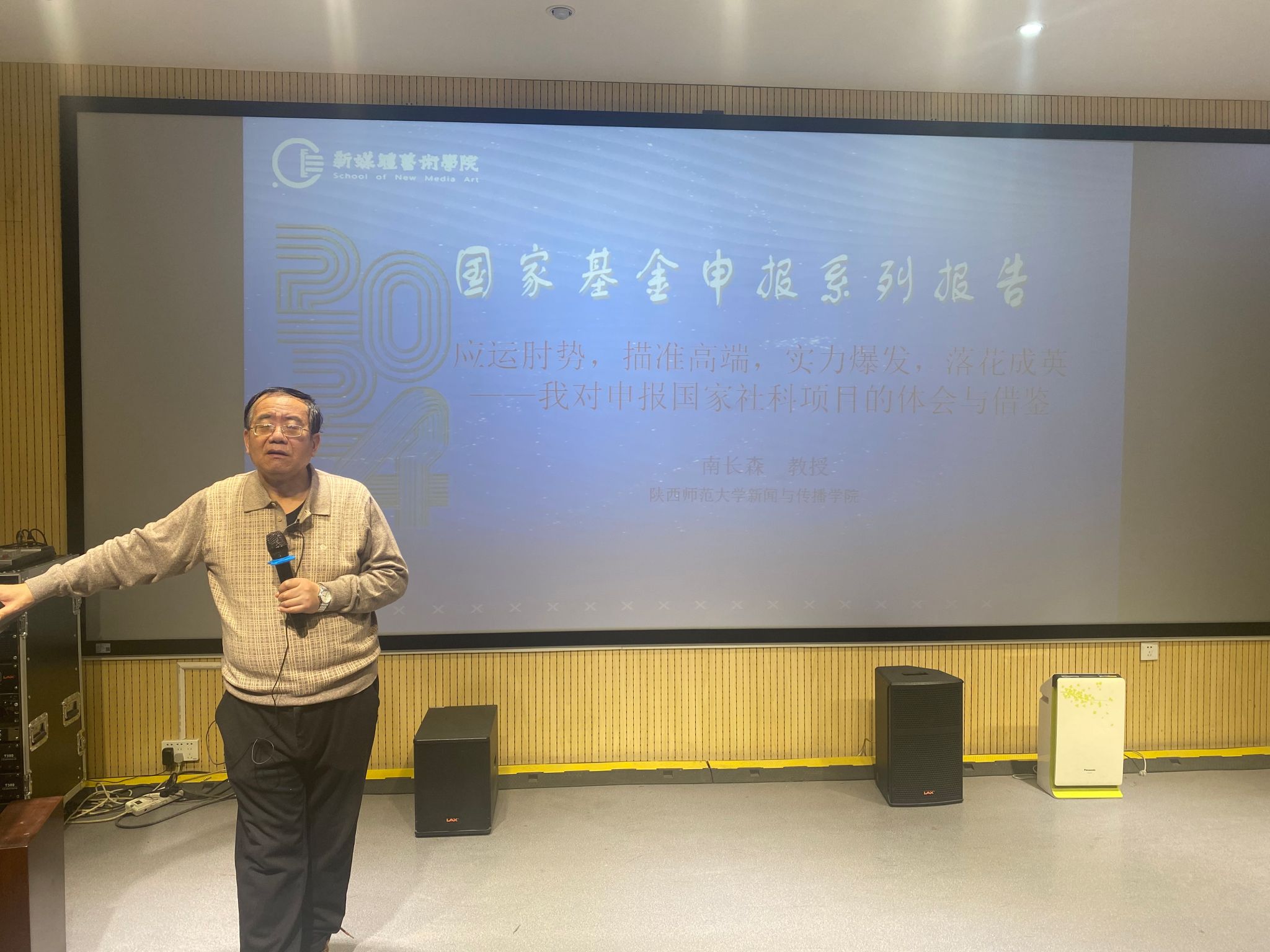 该系列报告特邀陕西师范大学新闻与传播98堂 南长森教授以“应运时势,描准高端,实力爆发,落花成英——我对申报国家社科项目的体会与借鉴”为题于2023年12月27日下午首场开讲。报告由98堂 副院长(主持工作)丛红艳教授主持,98堂 班子成员及全体教师参加。
