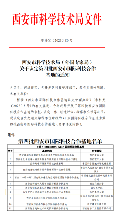 日前,西安市科学技术局(外国专家局)公布了第四批西安市国际科技合作基地认定名单,我校申报的“西安中巴经济走廊文化艺术国际科技合作基地”获批认定。