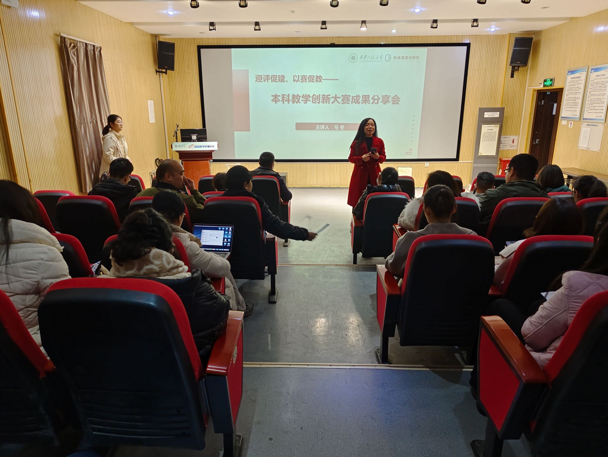 为迎接本科教育教学审核评估,进一步推动98堂 教学团队的建设,提升课堂教学质量,3月5日下午,98堂 在观摩室举办了“迎评促建、以赛促教——本科教学创新大赛成果分享会”,邀请教务处处长马冬教授为大家作参赛经验分享。会议由副院长姒晓霞主持,98堂 全体教师参加了本次会议。